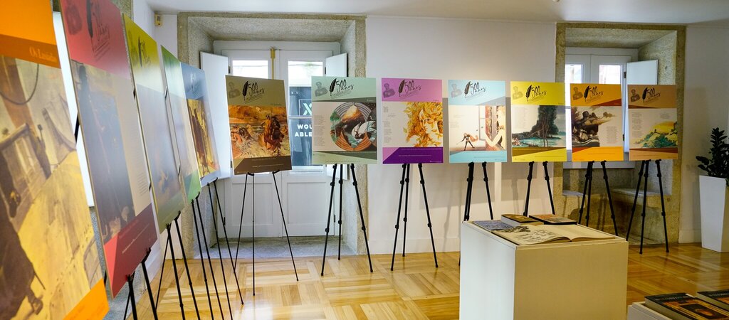 A mostra assenta em livros de finais do século XIX, XX e alguns novos, já editados este ano, no âmbito do V Centenário, como “Camões – Uma antologia”, de Frederico Lourenço, entre outros. Mas o especial destaque foram algumas edições d’ Os Lusíadas, como a de 1900, revista e prefaciada por Sousa Viterbo, ilustrada por Roque Gameiro e Manuel de Macedo e onde também se podem ver os retratos de Camões e Manuel Severim Faria (1590- 1649); a edição de 1980, comemorativa do IV centenário da morte do poeta, com ilustrações dos grandes pintores portugueses do início do século, como Columbano, Condeixa, Malhoa, João Vaz e Carlos Reis. Foi com base nestas pinturas, dos Lusíadas e da Lírica, ilustrada por Lima de Freitas, que foram elaborados os painéis, cerca de duas dezenas, que acompanham a mostra documental. Da exposição fazem parte também algumas obras da bibliografia passiva camoniana, desde autores como António Sergio, Vitor Aguiar e Silva, Bernardo Xavier Coutinho e o primeiro número da revista Oceanos, editada pela Comissão Nacional para as Comemorações dos Descobrimento Portugueses. Presente também na exposição uma réplica de uma caravela quinhentista, construída por José Felgueiras, ilustre investigador da História Local, e que faz parte de uma exposição patente no Museu Marítimo de Esposende.