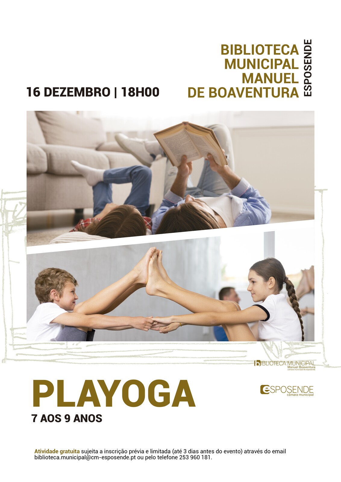 A Biblioteca Municipal promove uma sessão de playoga. Esta prática contempla um equilíbrio entre a diversão com histórias e músicas, exercícios de respiração, exercícios de meditação, relaxamento e posturas de yoga.