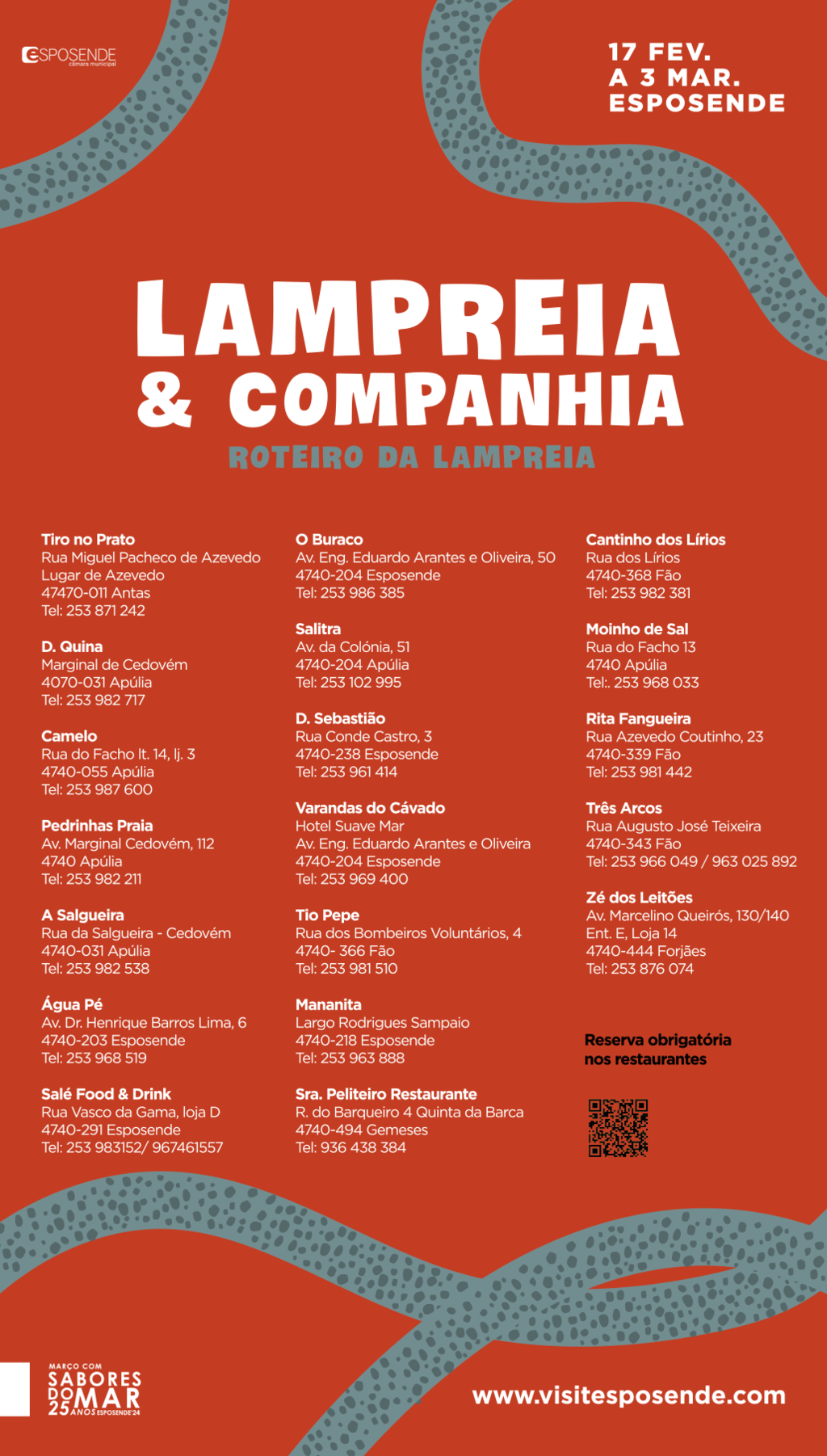 Aderem a esta edição os restaurantes Tiro no Prato, D. Quina, Camelo, Pedrinhas Praia, A Salgueira, Água Pé, Casa Salé, O Buraco, Salitra, D. Sebastião, Varandas do Cávado, Tio Pepe, Mananita, Sra. Peliteiro, Cantinho dos Lírios, Moinho de Sal, Rita Fangueira, Três Arcos e Zé dos Leitões. A reserva deve ser efetuada, previamente, junto dos restaurantes aderentes. Mais informações disponíveis em www.visitesposende.com. Esta ação enquadra-se no Plano de Ação para a Sustentabilidade, Crescimento e Competitividade do Turismo em Esposende – 2023_2027.