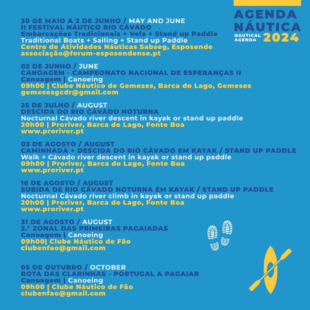 O calendário finaliza com duas organizações do Clube Náutico de Fão. No dia 31 de agosto realiza-se a 2.ª Zonal das Primeiras Pagaiadas e, no dia 5 de outubro, realiza-se a Rota das Clarinhas, Portugal a pagaiar.