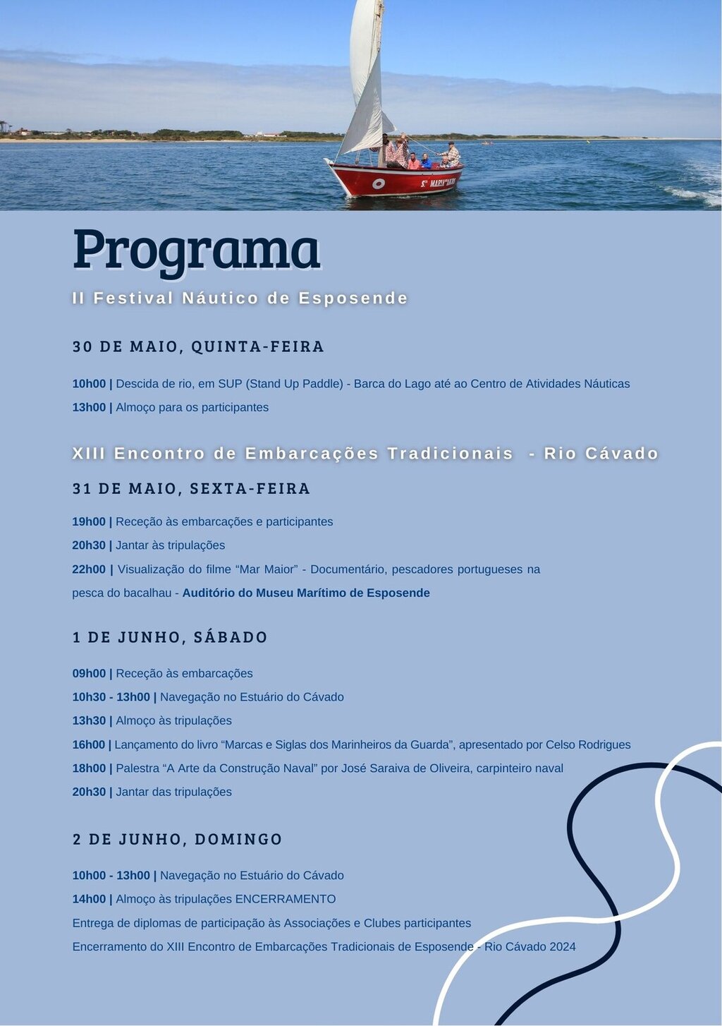 No dia 2 de junho repete-se a navegação no estuário do Cávado, entre as 10 e as 13 horas, constando o almoço de tripulações de uma cerimónia de entrega de diplomas de participação às associações e clubes participantes no 13.º Encontro de Embarcações Tradicionais de Esposende – Rio Cávado 2024.