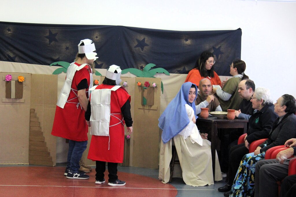 Nesta apresentação à comunidade sénior da JUM, na véspera do mês que assinala a tradição dos “Maios” ou “Maias”, os protagonistas foram os jovens utentes da APPACDM - Associação de Pais e Amigos do Cidadão Deficiente Mental, de Esposende, que, além de assumirem o papel de atores na dramatização do conto, se envolveram também na produção do cenário e adereços.