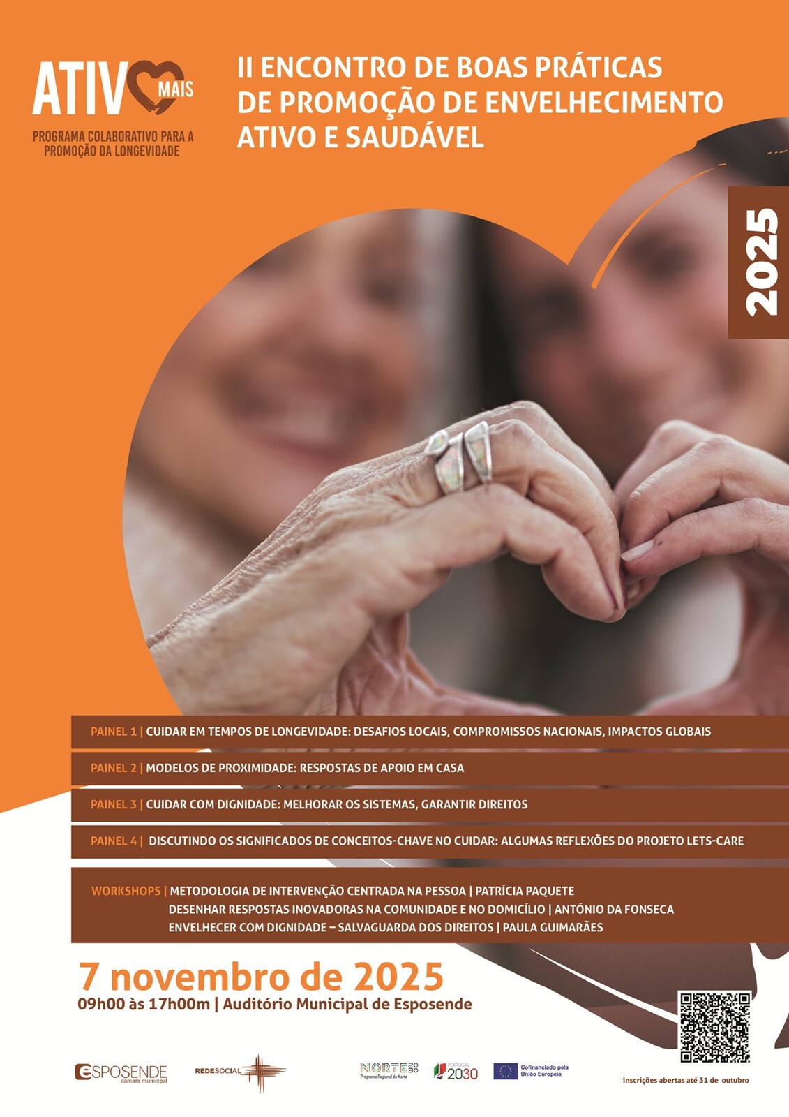 O acolhimento dos participantes decorre a partir das 9h00, a sessão de abertura acontece às 9h30 e os trabalhos iniciam-se às 9h45, com o painel “Cuidar em Tempos de Longevidade: Desafios Locais, Compromissos Nacionais, Impactos Globais”, por Alexandra Lopes, da Faculdade de Letras da Universidade do Porto.